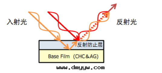 2 AR防反(fǎn)射:光(guāng)線(xiàn)在(zài)防反(fǎn)射层(céng)上(shàng)産生(shēng)二(èr)次(cì)反(fǎn)射,会(huì)和(hé)原反(fǎn)射光(guāng)産生(shēng)干(gàn)涉,利用(yòng)不(bù)同(tóng)光(guāng)學(xué)材料HC层(céng)産生(shēng)的(de)干(gàn)涉效果(guǒ)来(lái)消除入(rù)射光(guāng)和(hé)反(fǎn)射光(guāng),從而(ér)減弱(ruò)反(fǎn)射光(guāng),达到(dào)防反(fǎn)射功能(néng)